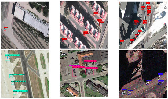 We improved several classic one-stage detectors with NAB and conducted many experiments on various datasets. YOLOv3-NAB, YOLOv4-Tiny-NAB, and SSD-NAB achieved a better performance than the original models. Figure 10 shows some detection examples of YOLOv3-NAB on different datasets. VHRAI is a diverse and challenging dataset whose average area per instance is 369 pixels. It perfectly meets our definition of small objects and is smaller than other famous datasets, such as VEDAI (512), HRSC2016, UCAS-AOD, and TAS. The results of YOLOv3-NAB and YOLOv4-Tiny-NAB on VHRAI clearly illustrate the effectiveness of NAB for small object detection. Furthermore, we compared NAB with SE and CBAM in the neck. NAB, which appends a convolutional bottleneck branch, showed better flexibility and performance while decreasing the model’s parameters. The experiments on TGRS-HRRSD demonstrate the capability of NAB for multi-scale detection in remote sensing. YOLOv4-Tiny had poor feature representation with the limitation of parameters. However, the result that YOLOv4-Tiny-NAB exceeded the original model by 3.72% mAP clearly verifies NAB can enhance the capability of feature representation and propel feature transition. These improved models also obtained better detection precision on PASCAL VOC. This fact indicates that NAB is not limited in remote sensing and can be generalized to detect nature images.