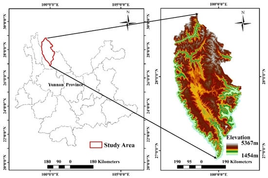 The study area in our work was selected to be Shangri-La, Diqing Tibetan Autonomous Prefecture, Yunnan Province, China. Shangri-La is a typical alpine and canyon area with high mountains and steep valleys. This area is located in the eastern part of the Longitudinal Valley area of the Three Parallel Rivers in the Hengduan Mountains on the southeastern edge of the Qinghai-Tibet Plateau. In fact, Shangri-La is a part of the parallel-flow area of the three rivers of the Salween (Nujiang), the Mekong (Lancangjiang), and the River of Golden Sand (Jinshajiang). The geographical coordinates of this study area are 99°22′–100°19′E, 26°52′–28°52′N (See Figure 1). The altitude within the area varies widely from low to high values, with significantly different weather conditions. The area has essentially a montane cold temperate monsoon climate, with distinct dry and wet seasons, where the wet rainfall season is mainly from June to October. Moreover, the geomorphic structures in the study area are mainly mountains, basins, plateaus, and river valleys. As well, the terrain is low in the southeast and high in the northwest, with a maximum elevation difference of 4042 m and an average altitude of 3459 m []. Furthermore, the forest coverage rate is about 74.99%, and the forest ecosystem is rich and well-preserved. The main tree species are Picea asperata Mast., Abies fabri (Mast.) Craib, Pinus densata Mast., Pinus Yunnanensis, and Quercus Sichuanensis Aquifolioides Rehd. Et Wils.