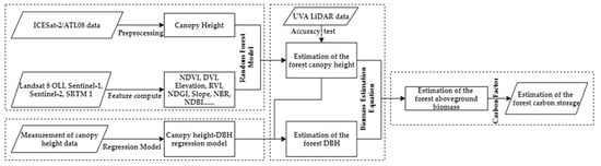 The ICESat2 ATL08 data and optical remote-sensing data were jointly used to estimate the forest canopy height in Shangri-La City. Then, measurement samples were used to establish a data model for the tree diameter at the breast height (DBH). Based on that model, DBH calculations were completed and used for forest biomass estimation in Shangri-La City. In addition, the forest biomass was used along with the carbon factor in order to estimate the forest carbon storage. Thus, the mapping of the forest biomass and the carbon storage in Shangri-La City was completed. A flow chart of the overall proposed methodology is shown in Figure 3.