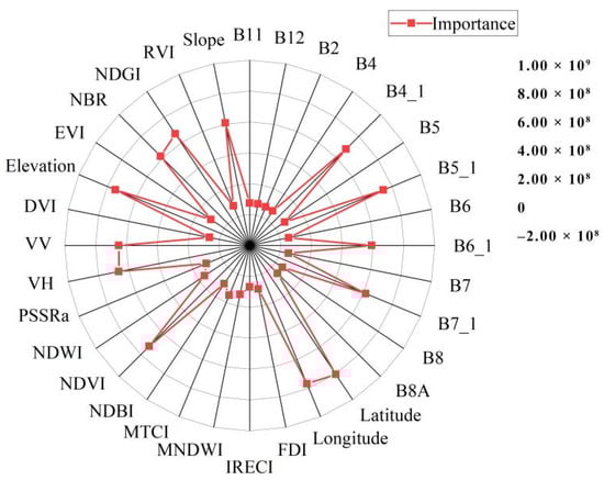 The ATL08 data type within the ICESAT-2 data represents vegetation height data that can be used solely for canopy height estimation. However, the number of light spots is quite limited and discrete, so it is necessary to augment this estimation process with rich high-resolution spectral information of optical remote-sensing images. Spectral band calculations were carried out by combining Sentinel-1, Sentinel-2, and Landsat8 OLI images. The indices extracted from these images are the normalized difference vegetation index (NDVI), the difference vegetation index (DVI), the ratio vegetation index (RVI), the normalized difference built-up index (NDBI), the normalized difference water index (NDWI), the enhanced vegetation index (EVI), the normalized burn ratio (NBR), and the normalized difference green index (NDGI). Topographic factors of slope and elevation were obtained by processing the DEM data. We thus computed three types of features (i.e., the vegetation indices, the terrain factors, and location information), found the importance of each feature, and established a random-forest model for high-resolution canopy height estimation from the corresponding spot locations (Figure 4) []. The candidate feature factors are shown in Table 2. Finally, the woodland part in the land-use data was clipped for high-resolution canopy height mapping in the study area.