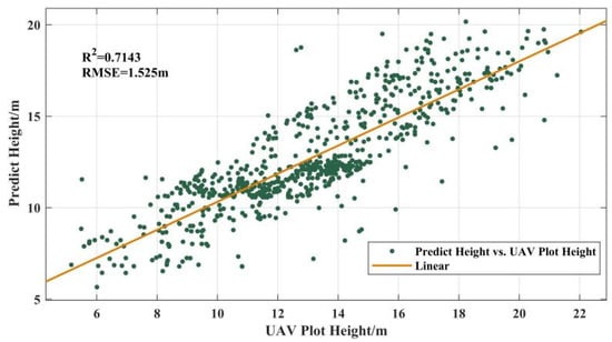 By combining optical remote sensing and microwave remote sensing images (collected from LandSat8 OLI, Sentinel-2, Sentinel-1) and ICESAT-2/ATL08 data, we extracted vegetation indices, terrain factors, the geospatial location, and other vegetation characteristics, and thus established a random-forest regression model between these factors and the canopy height []. Then, random-forest importance ranking was conducted on the feature factors, and the factors with the greatest influence were selected. Model training was carried out again, and high-resolution canopy height estimation was finally completed. The forest canopy height map for Shangri-La City was obtained by dividing the woodland distribution range into 30-m land-use data of GlobeLand 30. The features were ranked by a random-forest algorithm, and the features with the greatest influence on canopy height estimation were found to be the longitude, latitude, slope, elevation, NBR (Normalized Burn Ratio), NDGI (Normalized Difference Greenness Index), NDVI (Normalized Difference Vegetation Index), VV (Vertically-polarized band in Sentinel-1), VH (Horizontally-polarized band in Sentinel-1), B4_1 (Red band in Landsat8 OIL), B5_1 (Red-edge band in Landsat8 OIL), B6_1 (First shortwave-infrared band in Landsat8 OIL) and B7_1 (Second shortwave-infrared band Landsat8 OIL). The feature ranking results are shown in Figure 5. For comparison with the inversion result, a canopy height model (CHM) with the same resolution as the inversion result was generated by processing the UAV airborne LiDAR data obtained from field measurements. The model has a coefficient of variation of R2 = 0.7143, and this shows that the inversion result is somewhat correlated with the measurements and is thus relatively reliable (Figure 6). The high-resolution canopy height estimation result is shown in Figure 7. Obviously, the forest canopy height map estimated by the random-forest model is basically in line with the actual situation in Shangri-La City. Indeed, Shangri-La City is rich in forest resources, where the forest canopy height ranges between 2.28 m and 30.96 m. This height distribution is different from that of the single-tree height measurements in the field. This is because we used Landsat8 remote-sensing images for canopy height estimation, and the resolution of the obtained result was 30 m. Each pixel represents the average tree height within 900 m2 of the surrounding area. In terms of spatial distribution, the forest canopy height in the east side of Shangri-La City is higher than that in the west side. This is mainly because pine trees (such as the Pinus yunnanensis and the Pinus densata Mast.) are more distributed in the west side of Shangri-La, and these trees are higher than Picea asperata Mast., Abies fabri (Mast.) Craib and other Chinese fir trees.