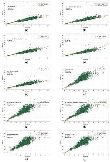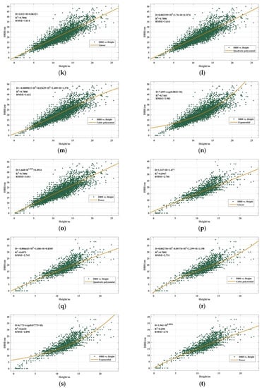 The tree diameter at the breast height (DBH) is directly related to the growth status of a tree. Generally speaking, according to the scale rule of vegetation growth, the larger the DBH in a stand is, the higher the trees will be, that is, there is a positive correlation between the DBH and the tree height []. In this study, single-tree height and DBH field measurements were used for data cleaning and outlier removal. A regression model could thus be established with the tree height as the independent variable and the DBH as the dependent variable. Different types of such a model are shown in Table 3. Through model evaluation, the best model fitting the data can be selected and used to predict DBH values from given canopy heights. Therefore, by feeding high-resolution estimates of the forest canopy height into the Height-DBH regression model, corresponding high-resolution DBH estimates can be obtained.