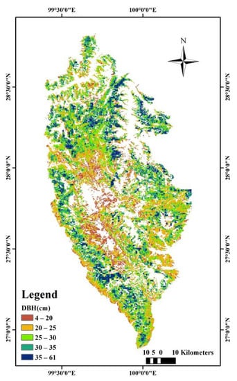 Based on the cubic-polynomial model, the high-resolution canopy height map estimated from space-borne LiDAR data (Figure 7) was used to obtain the corresponding high-resolution DBH map (Figure 9) in Shangri-La City by raster computations. The maximum and minimum DBH values were found to be 64.11 cm and 4.42 cm, respectively. Also, most of the DBH values were concentrated between 20 cm and 35 cm. These results are consistent with the actual field measurements.