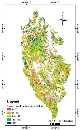 In our work, the forest carbon factor was used to convert the forest aboveground biomass into forest carbon storage. However, because the biomass and carbon storage were not directly measured, the carbon factor could not be estimated in practice. For typical tree species in Shangri-La City, measurements of the average carbon content have been reported: Pinus yunnanensis stands (51.48%), Pinus densata Mast. (51.31%), Abies fabri (Mast.) Craib (50.79%), and Quercus aquifolioides Rehd. Et Wils. (48.71%) []. These carbon content levels are clearly different among the four tree species. However, the carbon content levels are essentially the same for parts of the same tree species. The carbon content variations among different tree species (for the same tree part) or among trees of different ages (from the same tree species) are small, with the maximum coefficient of variation not exceeding 6%, and the carbon content rate essentially within 47–55% []. Therefore, the median carbon content rate (50% or 0.5) was selected to convert the biomass into carbon storage in order to partially offset the positive and negative errors in the estimation of the carbon storage.