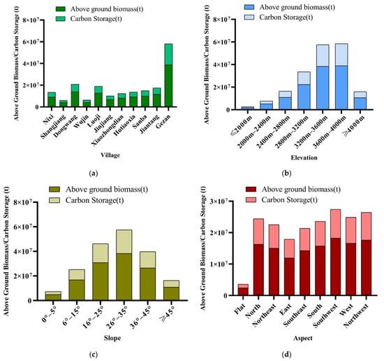 Spatial distribution of the aboveground biomass and carbon storage in Shangri-La City: (a) Distribution in different townships; (b) Distribution at different elevations; (c) Distribution at different slopes; (d) Distribution in different slope directions.