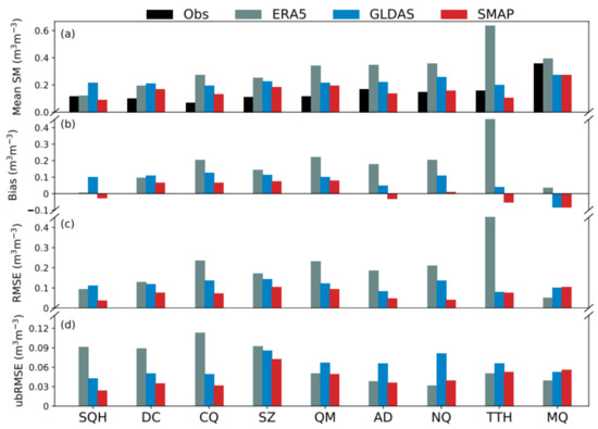 The climatological mean, Bias, RMSE, and ubRMSE of product-derived SM relative to observed SM are shown in Figure 2. All three products are wet-biased at most stations and the magnitude of the wet bias of ERA5 is the largest at all stations, except SQH and MQ. The ERA5 overestimates SM: the largest bias is 0.48 m3 m−3 (at station TTH). The GLDAS overestimates SM, except at MQ. The magnitude of the wet bias of GLDAS exceeds that of SMAP. The magnitude of the bias of SMAP is the smallest, and SMAP-derived SM is the closest to observed SM. For ERA5, the large bias is associated with large RMSE values that are spread across a wide range: ERA5 RMSE values are between 0.05 and 0.38 m3 m−3, and have an average of 0.2 m3 m−3. At stations SQH and MQ, ERA RMSE values are relatively small—0.09 and 0.05 m3 m−3, respectively. For GLDAS, RMSE values are between 0.07 and 0.14 m3 m−3, and have a mean of 0.11 m3 m−3. For SMAP, RMSE values are between 0.03 and 0.1 m3 m−3, and have a mean of 0.07 m3 m−3. The difference between product-derived and observed SM is the smallest in SMAP. For ERA5, ubRMSE values are larger at the stations in western TP (0.09–0.12 m3 m−3) and smaller at the stations in eastern TP. For GLDAS, ubRMSE values are large at all stations: average ubRMSE is 0.06 m3 m−3. For SMAP, ubRMSE values are relatively small at all stations: mean ubRMSE is less than 0.04 m3 m−3, which meets the accuracy requirements specified before the launch of the SMAP mission (average ubRMSE of 0.04 m3 m−3).