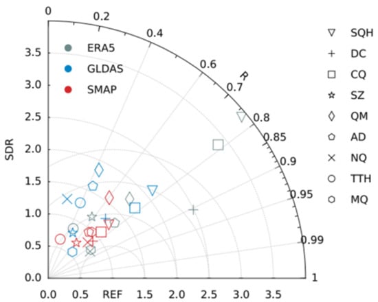 The Taylor diagram of R and SDR of product-derived SM relative to observed SM is shown in Figure 3. For ERA5, R values are between 0.45 and 0.91, and have an average of 0.74, while at stations DC, NQ, and MQ, R values are relatively high and are 0.9, 0.84, and 0.83, respectively. For GLDAS, R values are between 0.23 and 0.78 and the average is 0.54. For SMAP, R values are between 0.29 and 0.77 and the average is 0.65. The correlation coefficients of ERA5 are the highest, and those of GLDAS are the lowest. In terms of capturing the temporal variations of SM measured at stations, ERA5 has the best performance. For ERA5, SDR values are between 0.77 and 3.91 and the average is 1.83. At stations SQH, CQ, and DC, the amplitudes of ERA5-derived SM variations exceed those of observed SM variations, and SDR values are 3.91, 3.36, and 2.49, respectively. For GLDAS, SDR values are between 0.55 and 2.11 and the mean is 1.39. For SMAP, SDR values are between 0.64 and 1.57 and the mean is 0.99. The amplitudes of SMAP-derived SM variations are the closest to the amplitudes of observed SM variations.