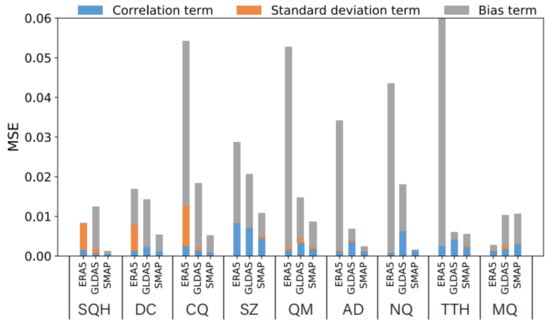 To further examine the differences between the three products and In Situ observations, we decomposed the MSE of each product at each of the nine stations (Figure 4). For ERA5, at station SQH, the standard deviation term exceeds the correlation term. This indicates that the amplitude of ERA5-derived SM variations needs to be improved. At stations DC and CQ, the correlation term is smaller than the standard deviation and bias terms. This indicates that the main error of ERA5-derived SM at these stations comes from errors in capturing the amplitude of SM variations and accuracy of SM. For ERA5, MSE is the smallest at station MQ. This indicates that ERA5 can sufficiently capture observed SM at MQ. At other stations, the large bias term indicates that the accuracy of ERA5-derived SM needs to be improved. For GLDAS, improvements are needed in terms of accuracy and correlation. At all stations, MSE of SMAP is smaller than the MSE of ERA5 and that of GLDAS. For SMAP, improvements can be made in terms of correlation and accuracy at stations SZ, QM, and MQ. However, relatively small biases may be caused by the mismatch of grid cells, which is related to the high heterogeneity of the land surface within grid cells.