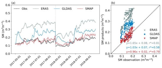 The spatial distribution of monthly average SM derived from ERA5, GLDAS, and SMAP for the warm season (May to August) between 2015 and 2021 is shown in Figure 9. All three products can capture the general characteristics of the spatial distribution of TP SM. Soil moisture is high in the southeast and decreases gradually across the TP towards the northwest, and is consistent with the spatial distributions of precipitation and land cover. Precipitation is the lowest over the desert in northern TP and the highest over the Hengduan Mountains in southeastern TP [53]. Forests in southeastern TP transition gradually across the TP into meadows, grasslands, and deserts towards the northwest [54].