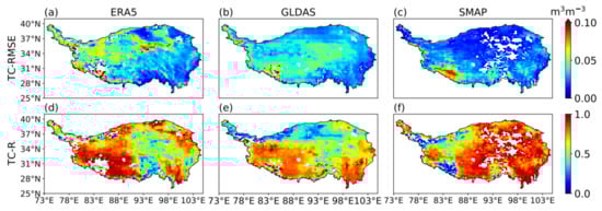 To further examine product performance over the entire TP, we created boxplots of TC-RMSE and TC-R for ERA5, GLDAS, and SMAP (Figure 7). The TC-RMSE values for ERA5 are the largest. Median and mean TC-RMSE values are 0.035 and 0.040 m3 m−3, respectively, for ERA5 and are considerably larger than those for GLDAS and SMAP. The range of the standard deviation of the random errors for ERA5 is the largest and the range for GLDAS is the smallest. This indicates considerable spatial variation in ERA5 performance and stable performance for GLDAS across the TP. For GLDAS, median and mean TC-RMSE values are 0.035 and 0.036 m3 m−3, respectively. Median and mean TC-RMSE values for SMAP are the smallest and are 0.023 and 0.026 m3 m−3, respectively. The range of TC-RMSE values for SMAP is smaller than that for ERA5. For TC-R, GLDAS values are the lowest (median of 0.63 and mean of 0.61), and SMAP values are the highest (median of 0.81 and mean of 0.75). Median and mean TC-R values for ERA5 are 0.70 and 0.68, respectively. There is little difference between the ranges of TC-R values of the three products. Therefore, we infer that the performance of SMAP is superior to that of ERA5 and GLDAS in terms of both TC-RMSE and TC-R, which is consistent with the results of the product evaluation based on In Situ observations.