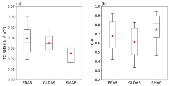 Boxplots of (a) the standard deviation of random errors derived from triple collocation (TC-RMSE) and (b) triple collocation correlation coefficients (TC-R) for all grids in the three products. Blue line indicates the median. Triangle indicates the mean. Bottom and top horizontal lines indicate the 10% and the 90% quantiles, respectively.