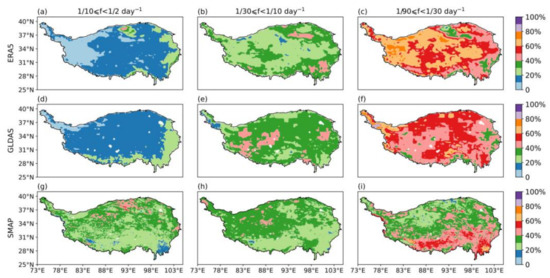 To further examine SM intraseasonal variability, we decomposed the daily SM time series into high-, intermediate-, and low-frequency bands and calculated the contribution of each band to the total variance of the three bands (variance percentage). The spatial distribution of the variance percentages of the three products is shown in Figure 11. For ERA5 and GLDAS, the variance percentage of the low frequency band is the largest and the variance percentage of the high frequency band is the smallest. There is little spatial variation in the variance percentages of the different bands. This indicates that the intraseasonal variability of SM derived from ERA5 and that derived from GLDAS are dominated by low frequencies. For SMAP, the variance percentage of the low-frequency band in southern TP is large and exceeds 40%, but in northern TP, there is little difference between the variance percentages of the different bands. This indicates that the variability of SMAP-derived SM is high on the 30- to 90-day scale in southern TP. In northern TP, the intensities of the signals of the three frequency bands are approximately equal. For ERA5 and GLDAS and relative to SMAP, the contribution of the high-frequency band over the entire TP is low and the contribution of the low-frequency band in northern TP is high.