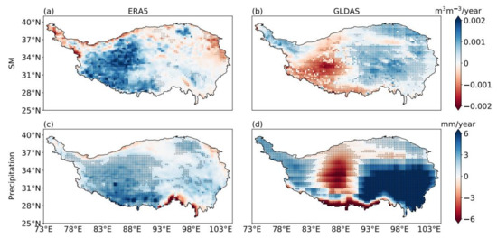 To examine the long-term trend of warm-season SM, we analyzed the spatial distributions of the trends of MJJA SM and simulated precipitation from ERA5 and GLDAS between 1981 and 2021 (Figure 12). Data from SMAP were excluded because they only cover 2015 to the present. For ERA5, SM has been increasing in western TP over the past 40 years at approximately 0.02 m3 m−3 per decade, while there is no clear trend in eastern TP. In contrast, for GLDAS, SM has been decreasing in western TP (in excess of 0.01 m3 m−3 per decade) and increasing slightly in eastern TP. Precipitation is the dominant driver of SM changes [55]. To further examine the inconsistencies between ERA5 and GLDAS trends, we analyzed the trends of simulated precipitation over the TP from ERA5 and GLDAS over the same period. For ERA5, precipitation has been increasing in western TP (in excess of 3 mm in warm season per year), and there is no clear trend in eastern TP. However, for GLDAS, precipitation has been decreasing in western TP (approximately in excess of 4 mm in warm season per year) and increasing in southwestern TP (in excess of 6 mm in warm season per year). For both ERA5 and GLDAS, spatial patterns of precipitation trends match their SM trends. Studies have shown that the summer precipitation has been increasing over the west TP in the last three to four decades, which is largely associated with the weakened westerlies [56,57,58]. Thus, ERA5 performs better than GLDAS in presenting the long-term trends of SM over the TP.