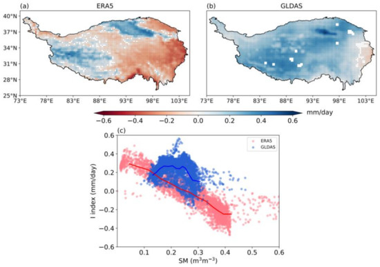 The spatial distribution of I derived from ERA5 and GLDAS is shown in Figure 13a,b. Values of I derived from both ERA5 and GLDAS are positive in western TP. This indicates strong ET response to SM anomalies: SM is the main factor limiting ET in this region. However, in eastern TP, there are large differences between I values derived from ERA5 and those derived from GLDAS. For ERA5, I value is mostly negative in eastern TP. This suggests that in this region, ET is insensitive to SM variations and energy is the main factor restricting ET. In contrast, for GLDAS, I value is mostly positive in eastern TP. For both datasets, the land-atmosphere coupling is stronger in the relatively dry western TP. The difference in the pattern of coupling strength between GLDAS and ERA5 is related to their different SM patterns (Figure 9), with ERA5 has much higher SM than GLDAS in eastern TP. GLDAS shows much weaker spatial variability in SM and I values (Figure 13c), with the highest I values in the intermediate SM condition. These are consistent with previous finding that the strongest land–atmosphere coupling is in the humid–arid transition zone, where ET is strongly influenced by SM (e.g., Koster et al. [7] and Wei et al. [59]).