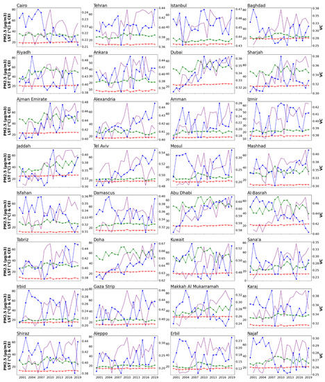 In this study, the annual changes of LST, VC, PM2.5 and CEI concentrations in 32 metropolises in the Middle East are investigated. The results show that according to PM2.5, the highest average yearly amount of air pollution belongs to the Doha metropolis (Figure 3), where the annual average amount of air pollution is 59.1 µg m−3. The cities of Abu Dhabi and Kuwait are ranked next in terms of air pollution in the study area, with annual average values of 54.2 and 54 µg m−3, respectively. The cities of Istanbul, Aleppo, and Irbid are among the less polluted metropolises with an annual pollution amount of less than 20 µg m−3. According to the statistics reported by the World Health Organisation (WHO), these cities are considered clean cities [35]. The trend of PM2.5 concentration changes showed that at a significance level of 1%, the cities of Jeddah, Makkah and Sana’a, and at a significance level of 5%, the cities of Tehran, Irbid, Jeddah, Karaj, Makkah, Izmir, and Sana’a have a significant trend of increasing pollution (Table 4). On the other hand, the cities of Alexandria and Cairo, at a significance level of 5%, have a downward trend in the amount of PM2.5 concentration. In addition, the results of this study showed that in the cities of Jeddah, and Makkah, the average annual growth is about 1 µg m−3 (Table 4).