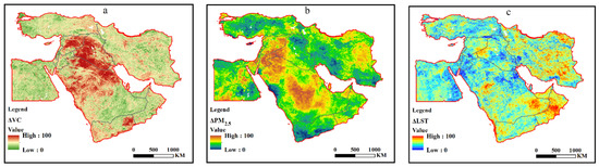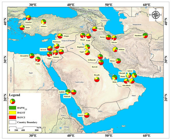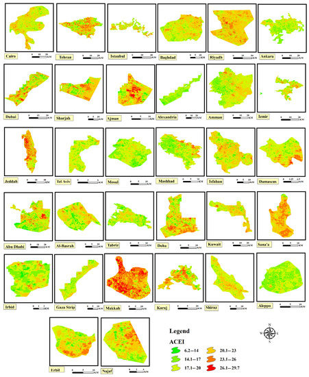 As stated in this study, we used CEI to assess the urban environmental changes in the metropolises of the Middle East. This index is calculated from the combination of changes in the three parameters: LST, VC, and PM2.5. The geometric mean value of CEI can be calculated using LST, VC, and PM2.5 values, as mentioned in Equation (1) [19].