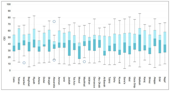 Analysis of the CEI trend shows that 25 of the 32 cities in the study had a significant increasing trend at a significance level of 5%. However, only 19 metropolitan cities showed a significant increase at a significance level of 1%. No substantial decreasing trend was observed in any of the cities in the study (Table 2). The most increasing trends in the CEI value can be seen in Makkah, Jeddah, Basra, Riyadh, and Sana’a. These cities are in acute conditions in terms of environmental issues, and the environmental quality in the urban areas of these cities decreased between 2001 and 2019 (Figure 3). According to the CEI, there is no significant reducing or increasing trend in Alexandria, Cairo, Tel Aviv, and Tabriz. The quality of environmental issues in these areas has not undergone visible changes. In Figure 5, a box plot presents descriptive statistics and the annual average CEI from 2001 to 2019. The maximum long-term average of the CEI (from 2001 to 2019) is observed in the cities of Aleppo and Makkah. The results indicate that the environmental conditions in these areas are poor. In addition to these cities, the cities of Riyadh and Amman, Tehran and Sharjah also show high CEI values. The lowest level of CEI was observed in Basra, Mosul, and Ankara. Interquartile ranges are high in the cities of Ajman, Basra, Jeddah, Mecca, Tehran, and Sharjah. This shows a great diversity in the environmental conditions in the studied metropolises during the study period. In addition, Figure 5 shows a skewness in most of the studied cities. This deviation indicates a lack of stability in environmental conditions in the Middle East. Examples of cities exhibiting this instability are Dubai, Karaj, and Basra.