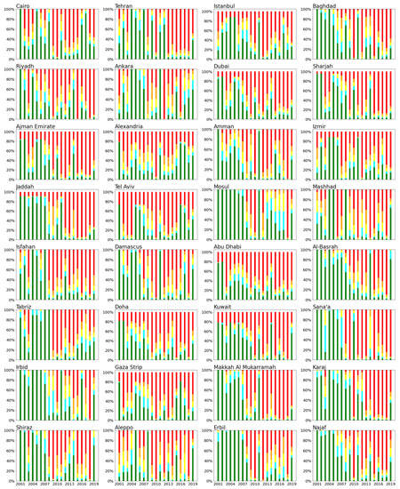 CEI variability represents the yearly difference between CEIs during the study period. For the assessment of CEI variability, we used an index known as Abnormality in CEI (ACEI). According to Figure 7, there is a severe anomaly in the CEI in Makkah, Sana’a, Doha, Jeddah, Ajman, Riyadh, and Tehran. This anomaly may be due to the climatic, economic, or social conditions of these areas in different periods. According to the results, the abnormality of this index is not only related to the population. This justification is because there was not much diversity in cities with large populations, such as Ankara and Baghdad. Still, in metropolises with a smaller population, such as Karaj, the amount of this diversity was high. In Ankara, Alexandria, Aleppo, Mosul, and Tabriz, the levels of anomaly and diversity are low. This shows relatively stable environmental conditions in these cities. As shown in Table 3, we investigated the classification of annual CEI changes in urban areas under different environmental conditions. The results of the investigation are presented in Figure 8. The results show that the degraded class for urban areas has ranged from 5% in 2005 to about 75% in 2018. In addition, the percentage of urban areas with unchanged conditions varied between 5% in 2005 and 15% in 2008. This shows that the areas of the no-change class have not changed significantly. The results of this study show that the highest environmental degradation was in 2018. During the studied period, it always has a downward slope (increasing the area of areas with higher CEI values). The range of improved sections (class with minimum destruction) has decreased.