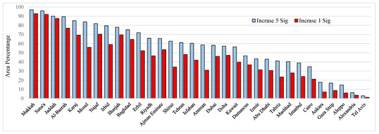 Figure 9 shows that the per cent of residential areas with a significant increase in CEI was identified in each metropolis based on MK trend analysis. For this purpose, the significant trend of each pixel was investigated in the long term. The results of this analysis show that the highest increase in the significance levels of 1% and 5% occurred in Makkah, Sana’a, and Jeddah. This increase in these cities was 92, 91 and 89 per cent of the entire urban area, respectively. At the significance level of 1% and 5%, the least changes in an increasing trend were observed in the cities of Tel Aviv, Alexandria, and Aleppo. The long-term annual average rate of Aleppo city for the CEI was very high, but the increasing percentage and the changing trend of its area are low. This shows that the amount of abnormality in this city was low (Table 4). The information obtained from the ACEI also confirms this issue. In cities such as Makkah, Jeddah, Riyadh, and Karaj, the amount of variation of the CEI during the study period is high. In other words, in the dominant part of the urban area (more than 70% of the entire area) at the pixel level, there is a significant increasing trend of CEI at the levels of 1% and 5%.