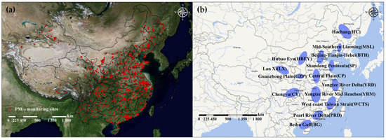 Study area: (a) the 1523 monitoring sites for surface air quality and (b) the fourteen urban agglomerations in China [29].