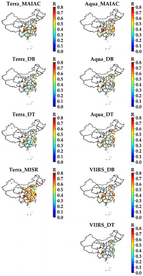 The spatial distribution of the correlation coefficient (R) between satellite AODs and the PM2.5 concentration. Terra_MAIAC and Aqua_MAIAC represent the distribution of the R for MODIS AOD retrieved by the MAIAC algorithm on the Terra and Aqua satellites; Terra_DB, Aqua_DB, Terra_DT, and Aqua_DT are for MODIS AOD retrieved by the DB, and DT algorithms on the Terra and Aqua satellites; Terra_MISR is for MISR AOD for version 23 on the Terra satellite. The VIIRS_DB and VIIRS_DT are for VIIRS AOD retrieved by the DB and DT algorithms on the Suomi-NPP satellite. Note that the points in the map are filtered by statistical significance (p-value < 0.05).