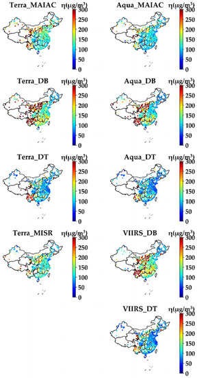 The spatial distribution of the PM2.5/satellite AOD ratio (η). Terra_MAIAC, Aqua_MAIAC, Terra_DB, Aqua_DB, Terra_DT, Aqua_DT, Terra_MISR, VIIRS_DB, and VIIRS_DT represent the same implication as in Figure 2.