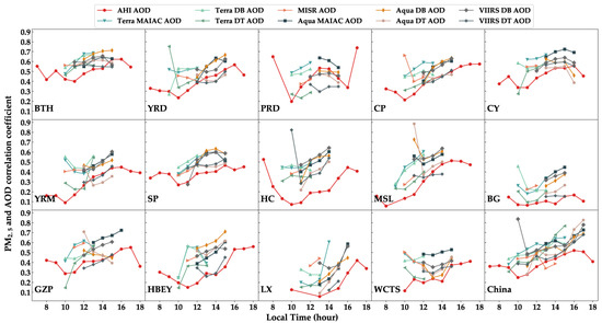 Based on the spatial-temporal collocations of AOD and PM2.5 for the years 2016–2018, Figure 4 shows the daily variation of the correlation coefficients between the LEO/GEO satellite’s AODs and PM2.5. Since the AHI L3 AOD is an hourly aerosol product, it is possible to determine the correlation coefficients with the ground-level PM2.5 at the hourly scale using the collocations for the three years. In contrast, the maximum temporal resolution for the LEO satellite AODs, such as MODIS on the Terra and Aqua satellites, is only twice per day. It demonstrates that over the 14 typical urban agglomerations, the correlation coefficient between MAIAC AOD (Terra and Aqua) and PM2.5 is consistently higher than the other satellite AODs, during both 10:00–13:00 and 12:00–15:00 local time (Figure 4). In addition, there is a comparable daily variation for the R for MAIAC AOD (Terra and Aqua) and AHI hourly AOD (showing a distinct daily variation as found in Xu et al. (2021) [29]), suggesting that it could be used to evaluate the daily variation of PM2.5 more accurately by merging the LEO and GEO satellite AODs (increasing the observations in a day).