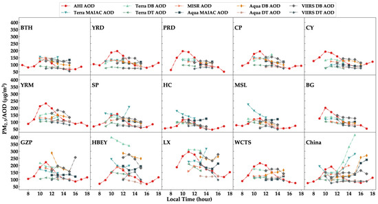 As shown in Figure 5, for the GEO satellite (AHI AOD), the η increases and then decreases throughout the day, reaching a peak around 11:00 a.m. across China, especially for the YRM, PRD, WCTS, and BG regions. This is most likely due to the combination of local traffic emissions and boundary layer variation during the day. There is no apparent daily pattern of variation for the LEO satellites (Terra/Aqua MAIAC, DT and DB AOD, MISR AOD, VIIRS DT/DB AOD). One possible explanation is that the observed frequency of the LEO satellites is insufficient to capture the daily variation pattern properly. Nevertheless, the PM2.5/MAIAC AOD ratio showed a slight decreasing trend from 10:00 to 15:00 local time (overpass time of Terra and Aqua satellite). In addition, the η for LEO satellite AODs was much lower than that of the GEO satellite AOD during the morning period, whereas the η for the LEO and GEO satellite AODs was more similar during the afternoon period in regions such as YRD, PRD, CP, CY, YRM, and BG. This demonstrates a substantial discrepancy between the LEO satellite AODs (Terra MAIAC, DB, DT AODs) and the GEO AOD (AHI AOD) in the morning period. These findings suggest that this ratio (PM2.5/AOD) can be an important influence factor in the near-surface PM2.5 estimation model, especially on a daily scale, and at least two AOD observations per day are required to determine the daily variance of the PM2.5 concentration.
