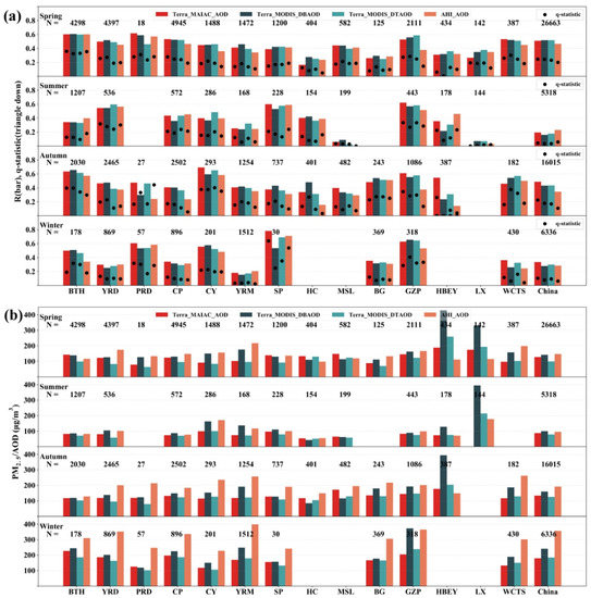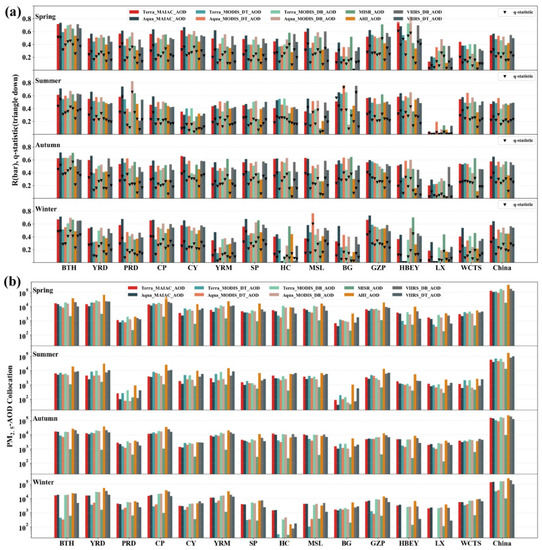 Seasonal fluctuations of the correlation coefficients (R), q-statistics (a), and spatial-temporal collocations (b) of AODs-PM2.5 over China and its 14 typical urban agglomerations. The black down triangle is the q-statistics of geo-detectors for each season; the different colored bars represent the relationship between multi-AODs and PM2.5.
