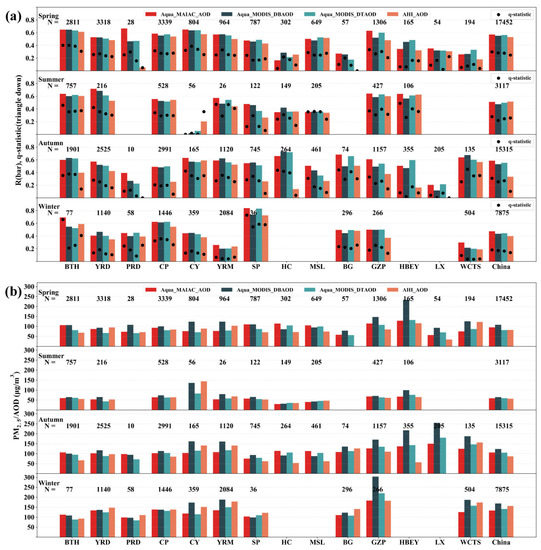 The relationships between Aqua MAIAC AOD, Aqua DT AOD, Aqua DB AOD, AHI AOD, and the ground-level PM2.5 concentration over China and its typical regions during different seasons. (a) The correlation coefficient (bar) and the q statistic (black dots); (b) the ratio (η). Note that when calculating the η, the PM2.5 is the same for all AODs.