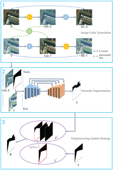 The proposed method is summarized as follows. We are given a pre-temporal image X and its corresponding label L, as well as the post-temporal image Y. The pre-temporal image X is translated into the generated image Fake X by the image color translation method, a semantic segmentation model is trained based on the data pair (Fake X, L), and the post-temporal image Y is tested to generate the building prediction P. The area of the intersection between the building prediction P and the pre-temporal label L, , is compared to the area of the previous temporal phase label L. The building segmentation with a higher ratio is replaced by the corresponding building label from the previous temporal phase to obtain the final updated result .