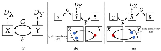 CycleGAN is implemented with a forward generator G that translates image x from domain X to image G(x) in domain Y and another backward generator F that translates image y in domain Y to F(y) in domain X. A discriminator Dx is used to determine whether the image is from domain X or generator F(y), and another discriminator Dy is used to distinguish whether the image is from domain Y or generator G(x). The training procedure of CycleGAN is divided into two supervised processes, the first of which is cycle consistency supervision, in which the image is translated from domain X to domain Y and then translated from domain Y to domain X again. The synthesized image G(x) needs to generate F(G(x)) by the backward generator F to make it as close as possible to the original input x. The cycle consistency loss constrained network is used to solve the problem that the GAN cannot output the corresponding image. Similarly, the same process is adapted to Y. The forward cycle consistency process (Figure 2b) is and the backward cycle consistency process (Figure 2c) is . The second stage is to determine whether an image is original or generated, i.e., the discriminator Dy discriminates whether the generated image of generator G comes from domain Y. Similarly, this process is also used by the discriminator Dx in domain X. In this case, the generator uses a residual neural network (ResNet) architecture, and the discriminator is PatchGAN [38].