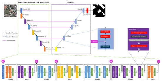 The top shows the UNet architecture, which consists of an encoder (green dotted box), a decoder (purple dotted box) and skip connections (pink). The bottom panel shows the details of the EfficientNet-b1 module, which includes seven blocks. The right side presents the submodule of the decoder and the MBConv module of the encoder block.
