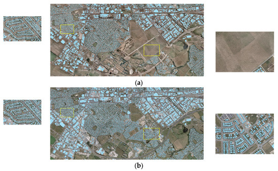 The study area is located in Christchurch, New Zealand, covering 20 km2. The datasets of pre- and post-temporal images were obtained in 2012 and 2016, respectively, with a spatial resolution of 0.3 m and 3-band aerial images (Figure 4). The pre-temporal building database and post-temporal building database contain 9938 and 12,091 labels, respectively. In the pre-processing stage, the original images and building labels are cropped into patches of 256 × 256 pixels with 50% overlap, and the final total number of crops obtained is 30,107 (30,107 pre-temporal tiles for training and 30,107 post-temporal tiles for testing).