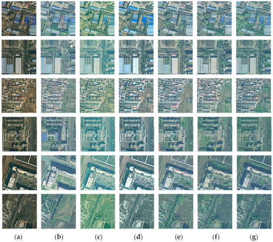 Image color translation results obtained on the Wuhan University building change detection dataset, (a) 2012 image, (b) 2016 image, (c) HM, (d) Reinhard method, (e) DRIT, (f) UNIT, and (g) CycleGAN.
