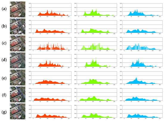 RGB histograms of the image color translation results obtained on the Wuhan University building change detection dataset, (a) 2012 image, (b) 2016 image, (c) HM, (d) Reinhard method, (e) DRIT, (f) UNIT, and (g) CycleGAN.