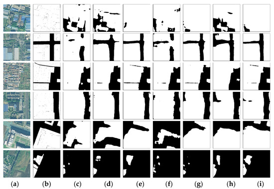 Results obtained by different semantic segmentation methods on the Wuhan University building change detection dataset, (a) 2016 image, (b) 2016 ground truth, (c) PSPNet, (d) DeepLabV3, (e) OCRNet, (f) Segformer, (g) SwinTransformer, (h) UNet(ResNet50), and (i) UNet(EfficientNet-b1).