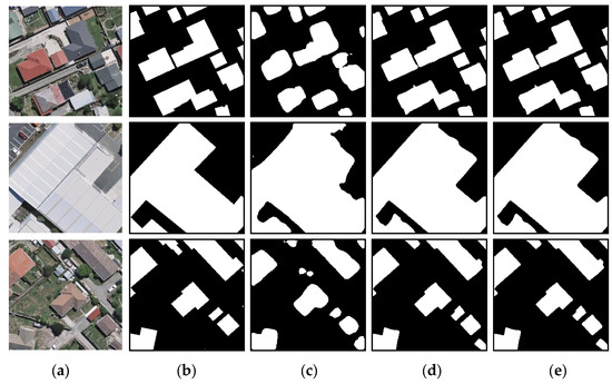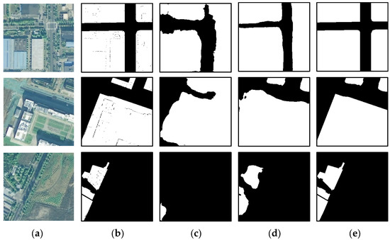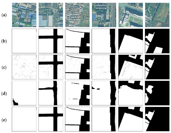 Comparison of ablation visualization results on the Wuhan University building change detection dataset, (a) 2016 image, (b) 2016 ground truth, (c) baseline, (d) baseline + CycleGAN, (e) baseline + CycleGAN + the post-processing update strategy.