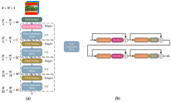 33]. Particularly, it exhibited strong robustness to severe occlusions from foreground objects, random patch locations, and non-salient background regions. However, using Swin-transformer alone in object detection requires large computing resources as the encoding–decoding structure of the Swin-transformer is different from the conventional CNNs. For example, each encoder of Swin-transformer contains two sublayers. The first sublayer is a multi-head attention layer, and the second sublayer is a fully connected layer, where the residual connections are used between the two sublayers. It can explore the potential of feature representation through a self-attention mechanism [