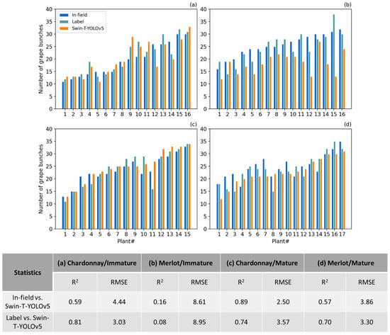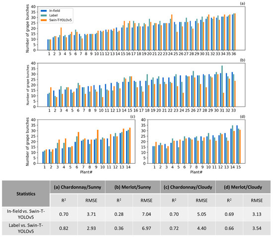 2 and RMSE between Swin-T-YOLOv5 and in-field counting had the similar trends of the ones between Swin-T-YOLOv5 and manual labeling in general, potentially because some of those heavily occluded grape bunches were not taken into consideration for labeling during the annotation process. However, the values changed vastly for the two different grape varieties under various conditions. It was clear that Swin-T-YOLOv5 did not perform well on the Merlot variety when the weather condition was sunny. While for Chardonnay, the model performed well under either condition (