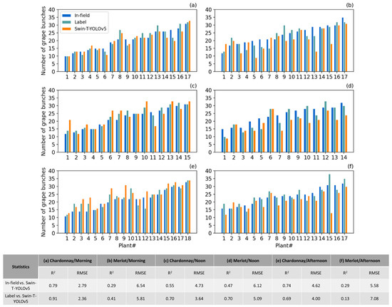 Figure 7). In addition, Swin-T-YOLOv5 underperformed on the Merlot variety when the sunlight condition was in the afternoon. Comparatively, it worked better on Merlot at noon. For Chardonnay, the predictions were more accurate (
