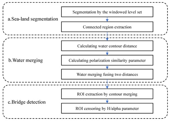 As a summary of the existing bridge detection methods, problems exist in both the sea–land segmentation and feature extractions. In the aspect of the sea–land segmentation, correct results are difficult to obtain in a strong noisy environment. Region-based segmentation methods based on the statistical distribution of a single pixel are prone to obtaining wrong segmentation results because of the possibility of incorrectly connecting low-scattering regions such as soils along the coast or water regions on land with the real sea regions. When the area of the strong-scattering regions is too large, the two-region segmentation method may segment the image into a strong-scattering region and the other. Additionally, the segmented contour of bridges is not smooth due to the coherent speckle noise. Because the scattering intensity of some water regions along the bridge interfered by the double-bounce scattering components between the metal structures of bridges is high, the deviation of the segmented contour is large sometimes. In terms of the feature extraction, there will be many false alarms in the naturally raised regions and the mariculture region along the coast due to the complexity of the terrain topography. Thus, to avoid sea–land segmentation errors and reduce the false alarm rate, we propose a sea-crossing bridge detection method based on windowed level set segmentation and polarization parameter discrimination. To reduce the segmentation errors caused by isolated noisy pixels, the method replaces the single-pixel statistical distribution in the traditional level set segmentation method with a joint statistical distribution of pixel-centered window regions first. The segmented water regions are then merged by fusing the polarization similarity parameters to eliminate some incorrectly segmented water regions. The bridge regions of interest (ROIs) determined by water merging are finally discriminated by the parameters of polarization entropy and scattering angle, effectively reducing the false alarm formed by naturally raised terrains.