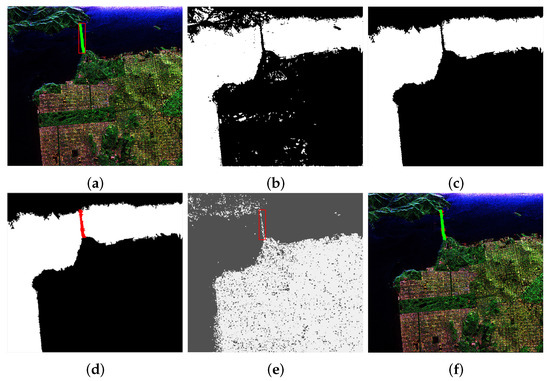 Sea-crossing bridge detection results of the data of AirSAR San Francisco. (a) Pauli pseudo-color image and ground-truth of bridges, where green pixels in red boxes are the marked bridge region. (b) The result of sea–land segmentation using the windowed level set method. (c) The result of sea–land segmentation after the post-processing of area thresholding. (d) The result of sea–land segmentation after water merging, where the red pixels are the recognized ROI. (e) The high-entropy and high-scattering angle regions by the thresholding segmentation, where the recognized ROI is marked in a red box. (f) The final bridge detection result, where the red pixels are the detected bridge and the green pixels are the ground-truth.