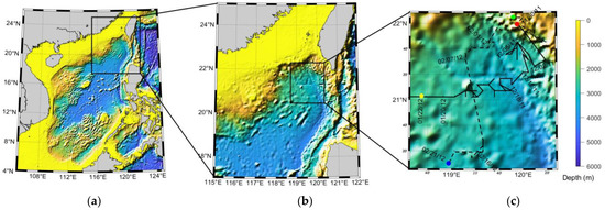 The location of the reconstruction area and the trajectory of the warm eddy center. (a) The whole of the South China Sea. (b) Northwest of the South China Sea. (c) The SSF reconstruction area and the trajectory of the warm eddy center by black line and the cold eddy by dashed black line. Red circle indicates the location and day that warm mesoscale eddy enters into the area and yellow circle for leaving out the area. Green circle indicates the location and day that cold mesoscale eddy enters into the area and yellow circle for leaving the area. The date marked is in the format Month/Day/Year.