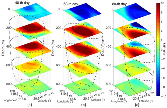 To clearly show the 3D SSF variations by the warm mesoscale eddy, the 40th, 60th, and 80th day 3D SSFs are demonstrated in Figure 3, with the 3D structure of the warm mesoscale eddy being highlighted by black dashed lines. From the highlighted areas, it can be observed that the inducing positive sound speed anomalies lie in the depth of 100 m to 700 m. The cold eddy is also shown in the corner of Figure 3c, side by side with the warm eddy.