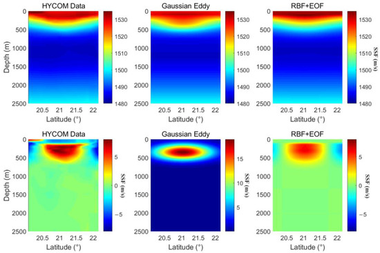 As shown in Figure 8, the vertical slices of 3D SSF reconstructed by the Gaussian eddy model and the first-order RBF + EOF are compared. The RMSE of Gaussian eddy and RBF + EOF are 1.46 m/s and 1.32 m/s, respectively. Their performances are basically similar. Considering the slight difference between them, RMSE of RBF + EOF is slightly lower because the eddy in HYCOM data has the shape of a bowl rather than a ball, and the error of EOF is relatively smaller than the Gaussian eddy model. According to simulation results, the performance of the first-order RBF + EOF is significantly superior from the 40th to 60th day. During this period of time, the mesoscale eddy is completely located in the reconstruction area (as shown in Figure 2), indicating that the first-order RBF + EOF has a pretty representation performance to characterize the 3D SSF dominated by one mesoscale eddy.