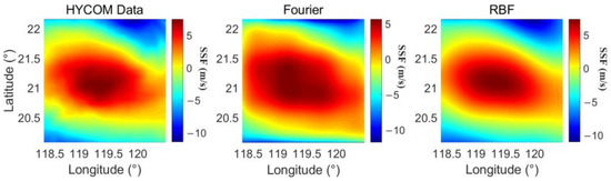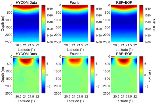 We use the 3D SSF data on the 60th day to represent 3D SSF, similar to Section 3.1, with the multi-order RBF + EOF method and the Fourier + EOF method. The parameters are set to , , . The center of RBFs is randomly selected. As shown in Figure 9, the 36-order RBFs represent the mesoscale more accurately in horizontal dimensions, compared with the first-order RBF in Figure 6. The vertical slice of a mesoscale eddy representation using multi-order RBF + EOF in Figure 10 is more delicate compared with the first-order RBF + EOF in Figure 8. The Fourier method in Figure 9 and Figure 10 has less recoverable detail compared with multi-order RBF + EOF, especially near the center of the eddy.