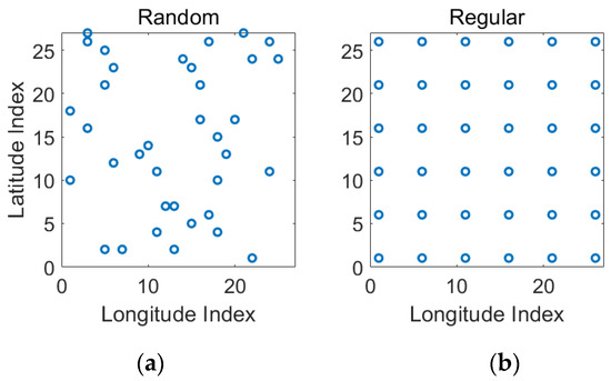 For the position’s selection of RBF center points, there are two rules, random selection, and regular selection. Regular selection refers to equally spaced points in the area being selected which makes the distribution of RBF centers uniform space. Take 36 orders of RBF as an example. Figure 11 shows the 36 points (blue circle) by random selection and regular selection in the two-dimensional horizontal region, where the horizontal and vertical axis represent the longitude and latitude grid points of the area to be reconstructed with grid size 1/12°.