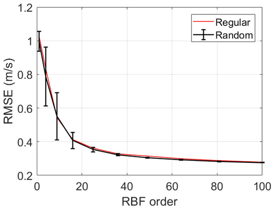The position of RBF centers will affect the performance of 3D SSF representation. We compare RBF center positions selected by different rules, including random selection and regular selection. Random selection will select P points in the area randomly and 100 Monte Carlo experiments are carried out. It can be seen from Figure 12 that the average performance of random selection is almost consistent with that of regular selection. The specific performance of random selection is related to the SSF data. As shown in the error bar in Figure 12, the performance of random selection may be better or worse than regular selection, while the latter always achieves a robust performance. In the case of low-order RBF order, the performance gap of random selection is large. Thereafter, the optimal center point needs to be obtained by other algorithms. As the order of RBF increases, the error bar gradually decreases to zeros. In the case of high-order RBF (for example, in the region of 200 km, the RBF is greater than 36 orders), the selection of the center point has little impact on the reconstruction performance, which indicates the selection rules of RBF centers will not be a key issue. Therefore, 36-order RBFs will be selected as a reference.