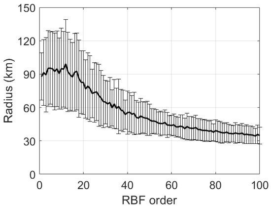 For different orders of RBF, the optimal radius is different. We test the 3D SSF data on the first day using 6 EOFs. As shown in Figure 13, with the increase of RBF order, the mean optimal radius (thick black line) gradually decreases from 90 km to 40 km, and the variance (thin line, error bar in figure) also decreases. This result is in conformity with the theory because with the increase of the number of RBF centers, the region represented by each order of RBF gradually converges from the global area to the local point. If the RBF center takes all grid points in the reconstruction area, the radius should be infinite so that the scale factor is zeros, that is, each order of RBF is equal to the value of the local point. This theory is called the Nadaraya–Watson regression estimator (NWRE) [32]. Within a value range, the radius is not very sensitive to RMSE. Whether 60 km or 80 km, the RMSE is very close, which indicates the radius is relatively robust. Therefore, 80 km will be selected as a reference radius for all simulations, which balances the performance of different RBF orders.